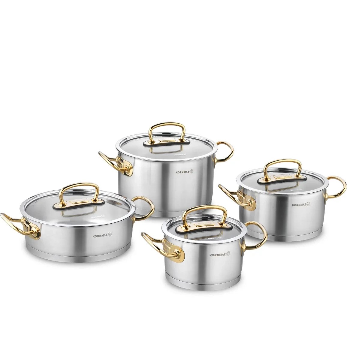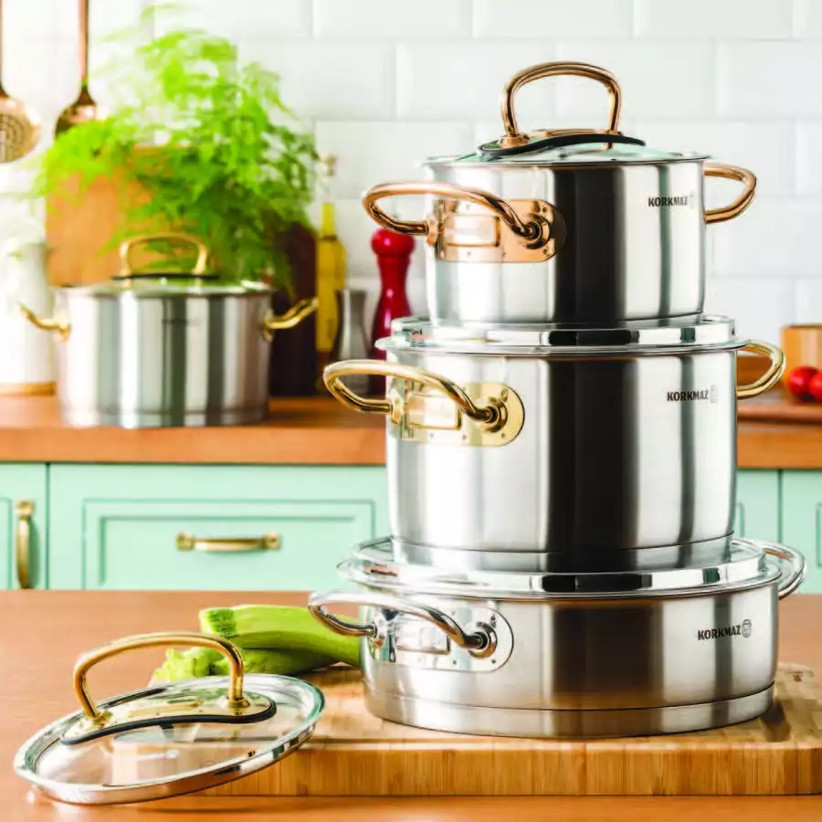 این سرویس قابلمه کرکماز دارای ٣ عدد قابلمه های زیبا در سایزهای 24, 20, 16 سانتیمتر می باشد. دارای یک ماهیتابه به سایز ٢٤ می باشد یکی از نکتههای جذاب این سرویس, طراحی مدرن آن است که ظاهر بسیار زیبایی دارد.علاقمندان به آشپزی همواره به دنبال بهترین ابزار و باکیفیتترین وسایل پخت و پز هستند. چون در زمان صرفه جویی میشود و طعم غذایی که طبخ میشود خوشمزهتر خواهد بود. علاوه بر کیفیت غذای آماده شده شما باید به اندازه کافی ظرف در اختیار داشته باشید تا سریعتر بتوانید آشپزی خود را به انجام برسانید. برای شما عزیزان یک پیشنهاد عالی داریم. سرویس قابلمه ٨ پارچه کرکماز پرولین مدل Korkmaz Proline A1148 Pot Set یک گزینه بهصرفه برای شماست.